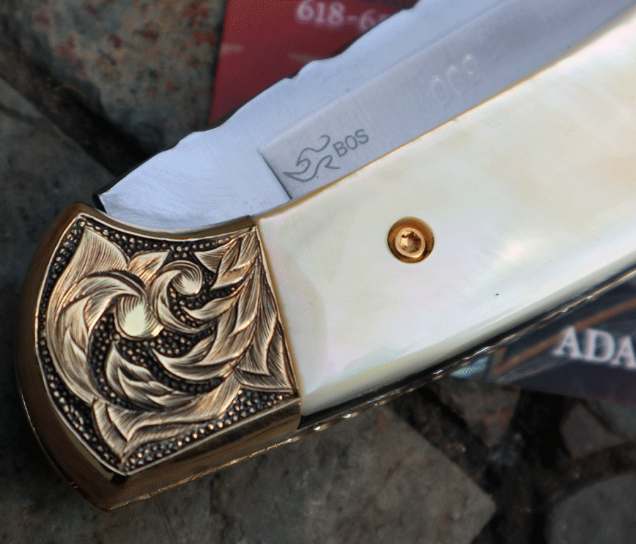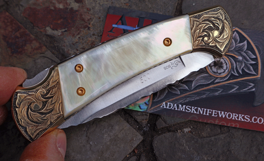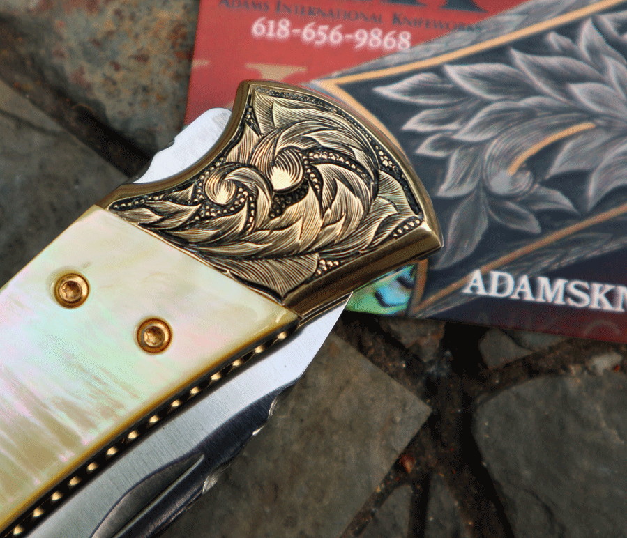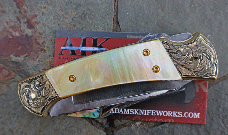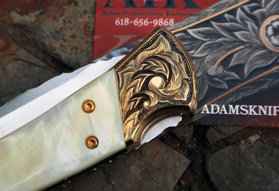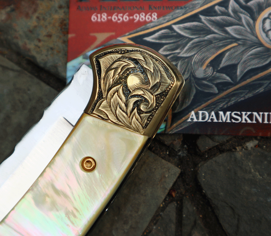 Nearly 10 hours of engraving time are in the bolsters! Gold Lip Pearl is cut directly from the shell in AIK's shop.