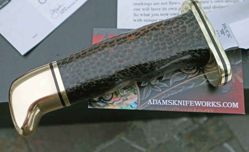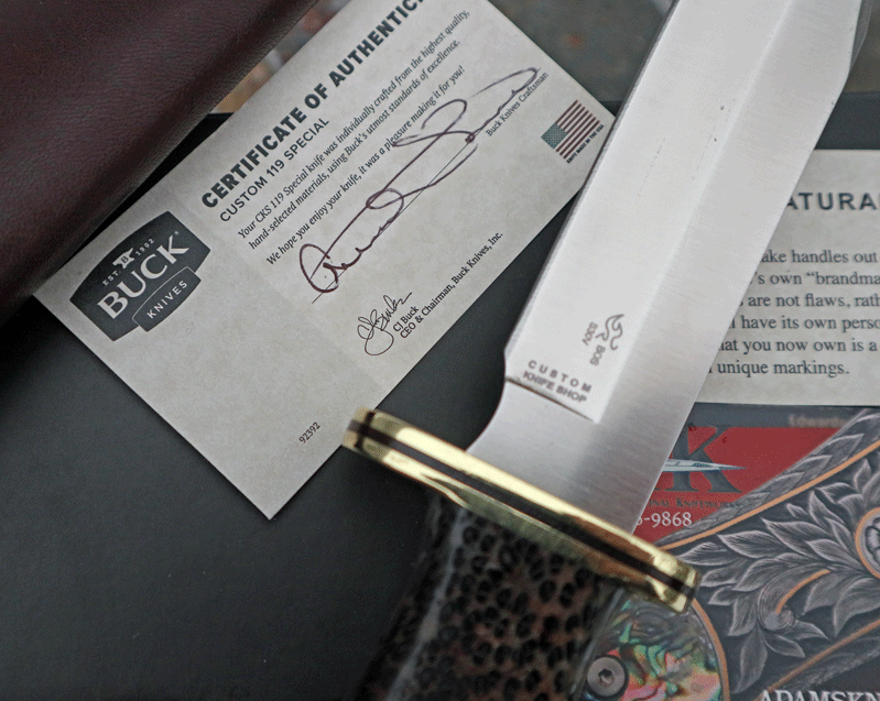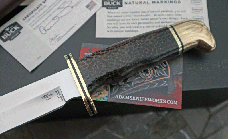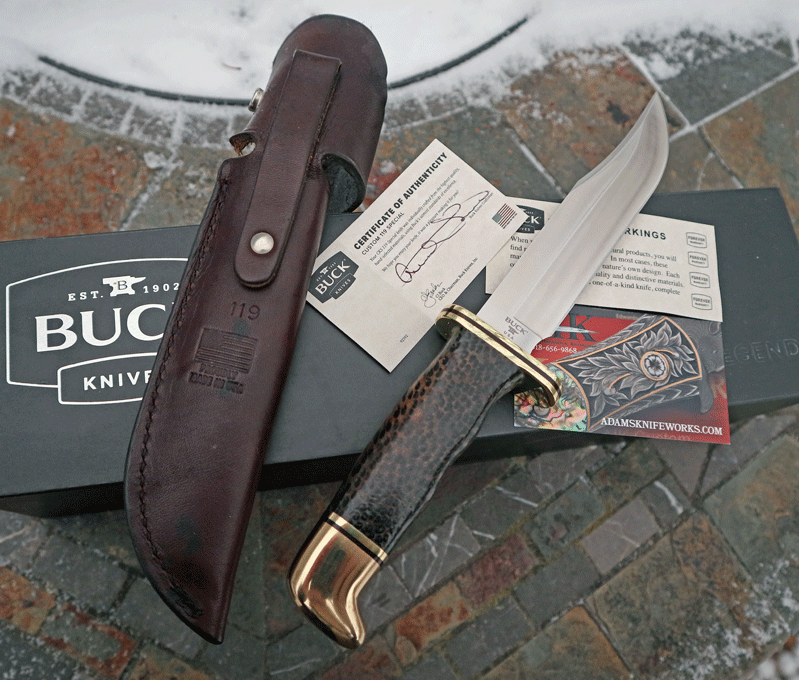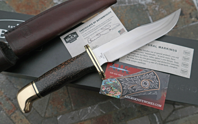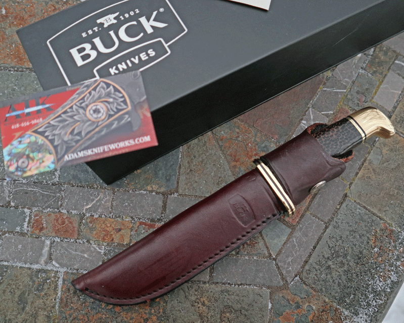 naturally gives the user a sure grip and fits your hand like a glove. Overall length is 10 1/2". Leather Belt Sheath with the Buck name. Mint Piece. Never used, carried or sharpened. Includes Custom Shop Box and Signed BUCK COA.