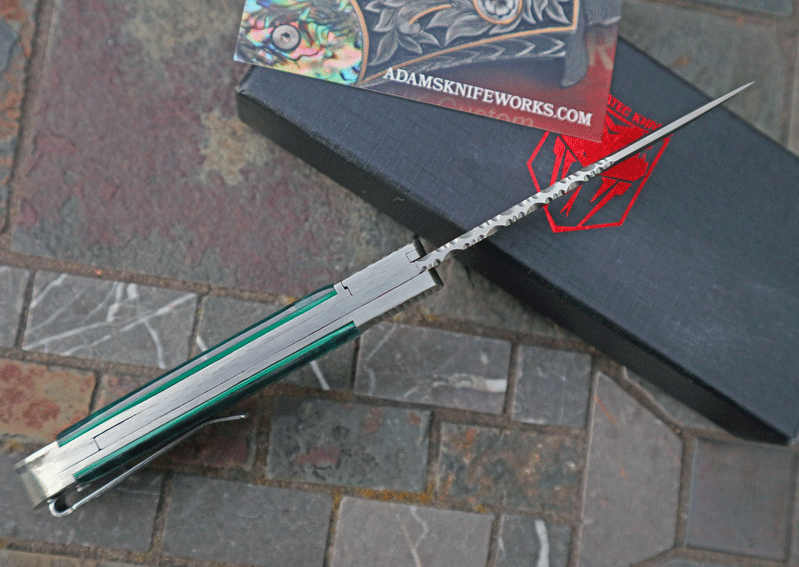 with a polished stainless Pocket Clip (Tip Up) on the backside . 3 1/4" Satin Finished Clip point Blade features D2 Tool Steel and Hand File Work on the Spine.
