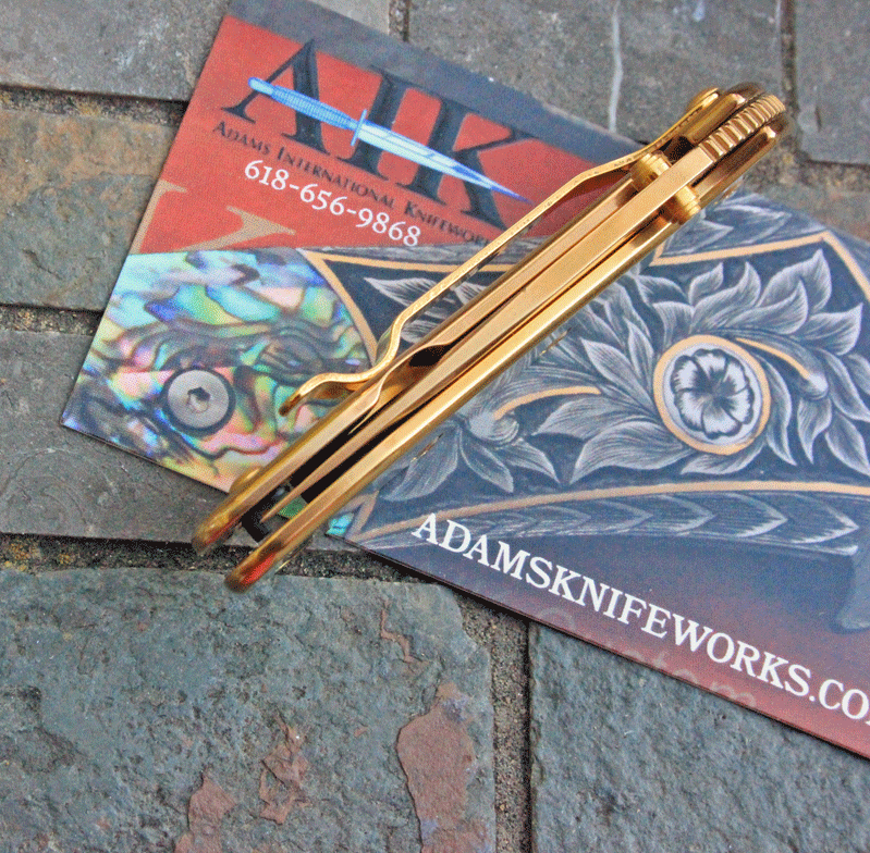 with a matching 420HC Gold Plated Blade that measures 1 15/16".. Dual Thumb studs. Simple to operate with a quick flick of your index finger on the top backspring with the assist lever or via the dual thumb studs. Rock solid frame lock with a sliding safety to prevent accidental discharge. Pocket clip on the back side.