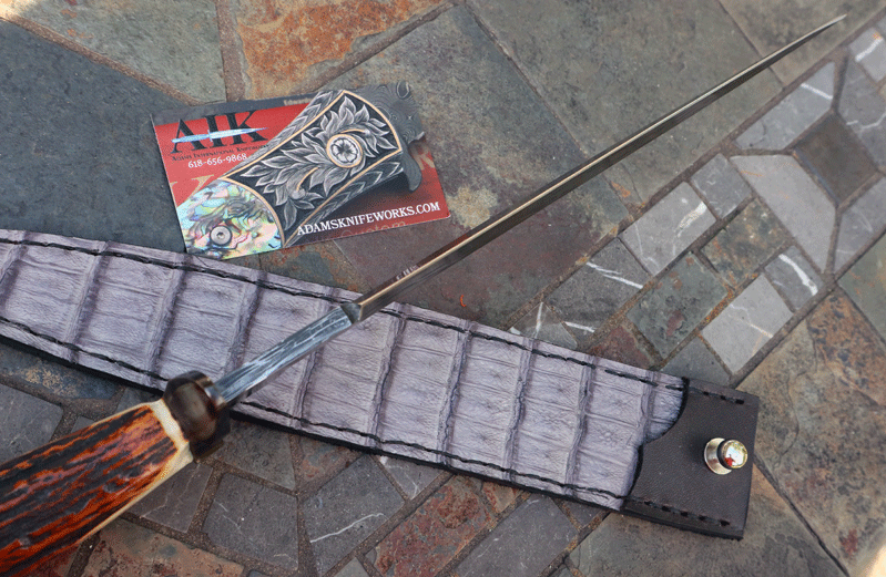 Sheath with a built in belt catch, (so yo can slide the sheath inside your belt, and the belt catches the stud), for easy access.(a design common in the late 1800's)..