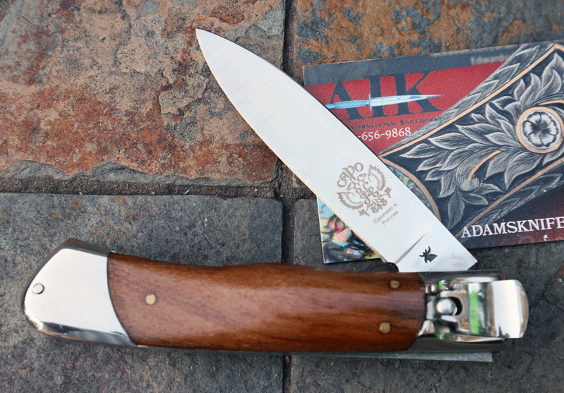 from Russia is a superbly constructed Lever Action Auto with a 3 1/4" Hollow Ground Blade has a cool etch and what appears to be a moose for a tang stamp..