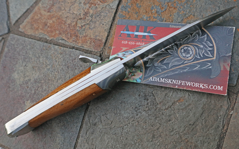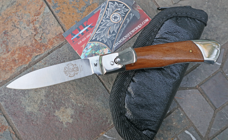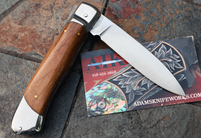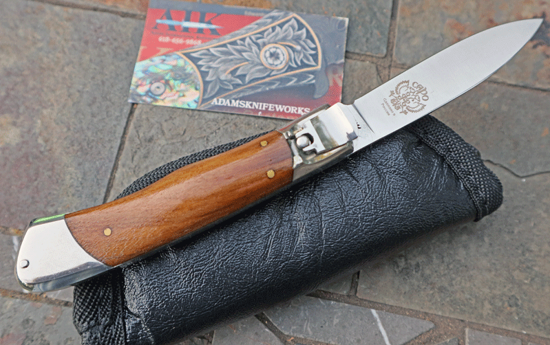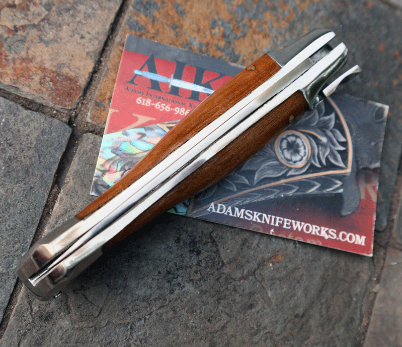 Unique curved stainless bolsters with extra thick liners. Operates like the Hubertus line of springers by depressing the lever; flipping up on the lever acts as the safety. Leaf spring operation with rock-solid lockup. Overall length open is 7 3/4". Extra Heavy Duty piece with Olive wood handles. Handles are "dove tailed" to fit the bolsters, (something you usually see only on higher-end knives). Unique shaped lever . No Longer Manufactured.