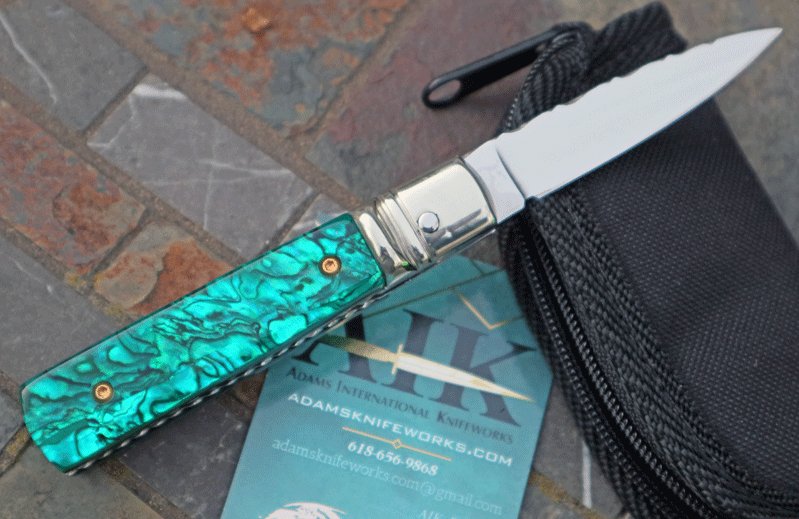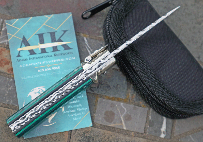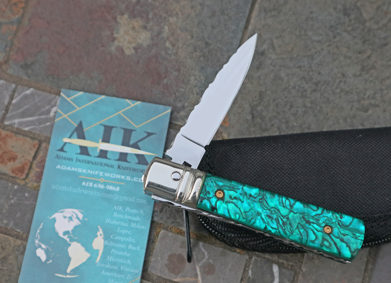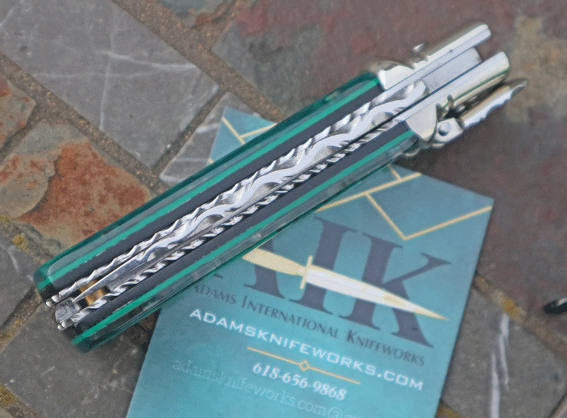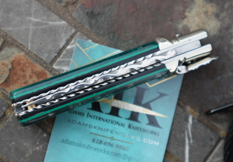 is gorgeous offering a spectrum of different green colors. Superb Quality piece with superb action and rock-solid lockup.Very similar to the Hubertus-Solingen in construction. Simply press down on the lever to activate the internal leaf spring. Flipping up on the lever acts as the safety. Overall open is 6". Highly Recommended! Inlcudes custom zippered pouch.