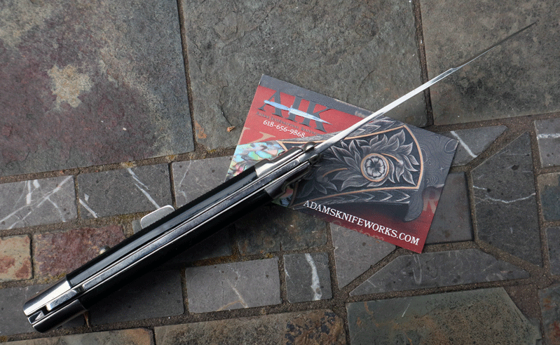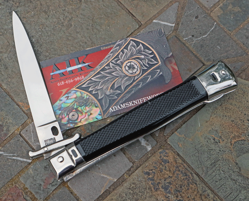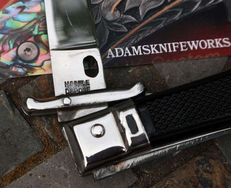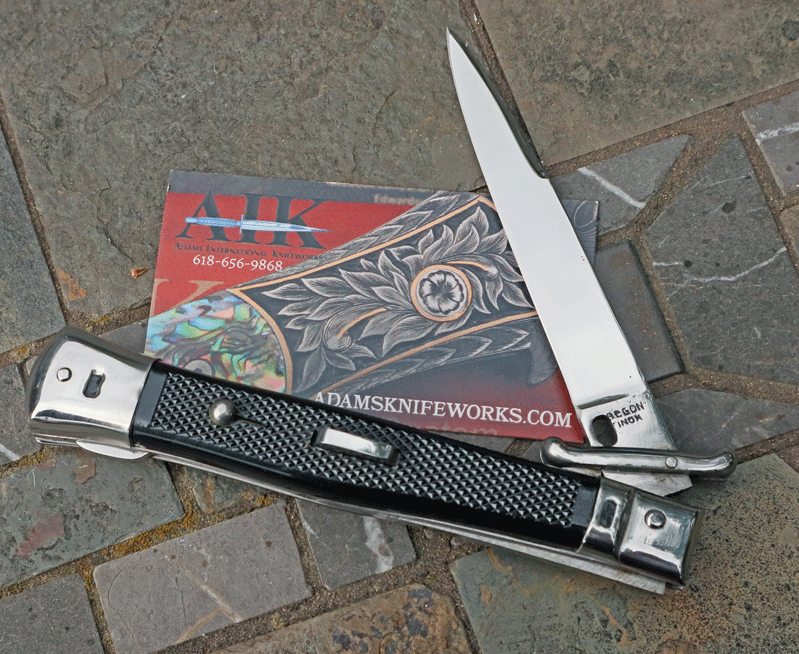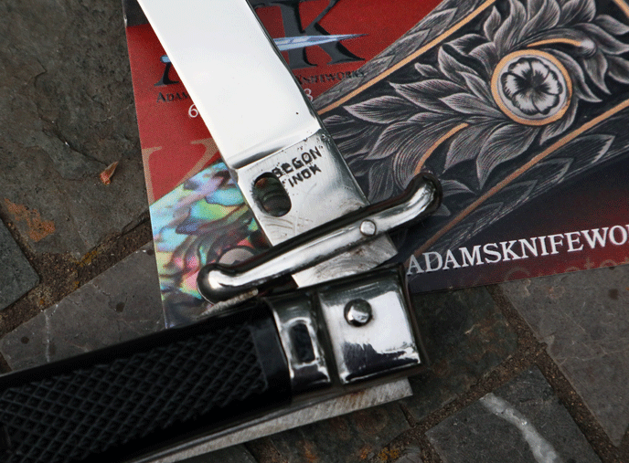 Bolsters, swing guards, and retangular push button are constructed of polished Stainless. Measures 5" closed. Weighs 4oz.. Features superb action. Lockback release... Side opening with a drop in leaf spring design.
