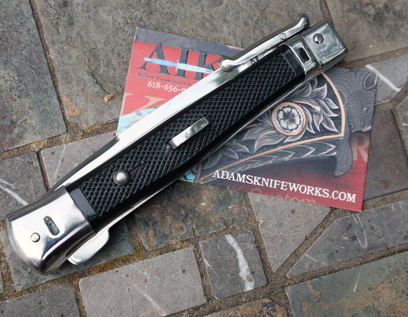 Blade features a "swedge" grind on the top of the blade (1 3/4" along the top). Measures 9 1/4" overall open. Handles are a non-slip black checkered composition with stainless liners. Features a zinc safety.
