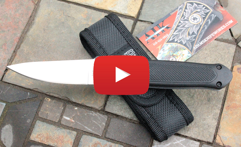 double action models out there with the hidden button mechanism. This model has a Zytel frame with stainless liners and non-slip hard rubberized inlays on both sides. Pocket clip on the backside. Satin blade is marked