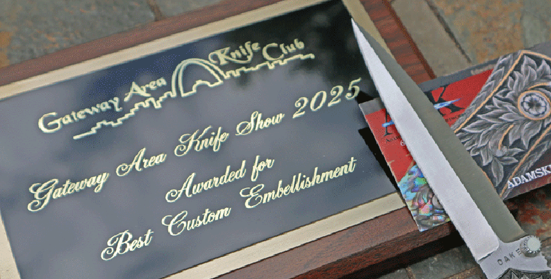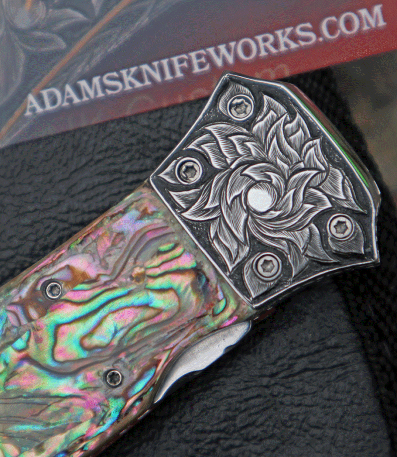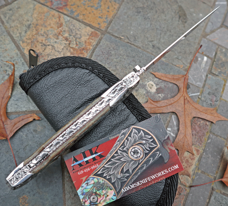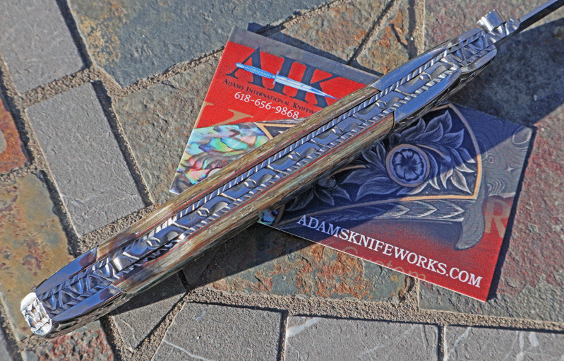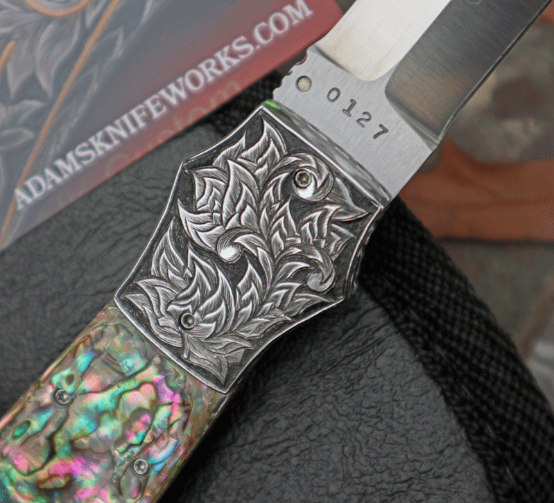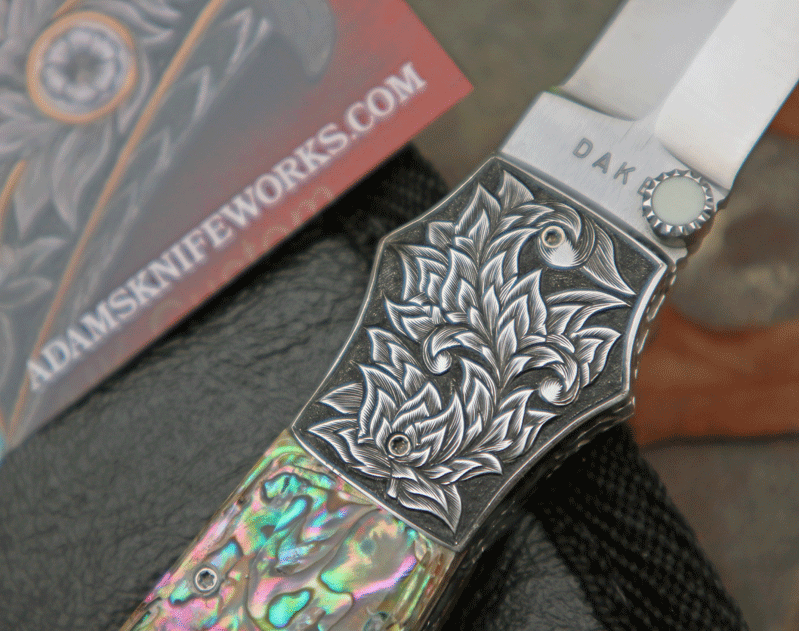 This knife won Best Embellishment at the recent Gateway Area Knife Show held in August 2025 in St Louis for the engraving work by Andrew Adams. (See Pics). The Engraving alone on this knife is valued at $1500, Knife is valued at $1,000 without the engraving work, making the retail on this piece @ $2,500+.