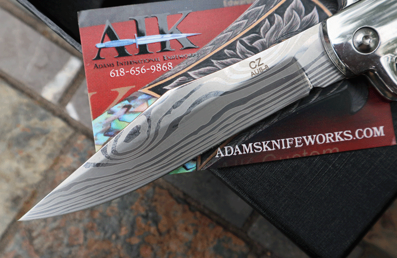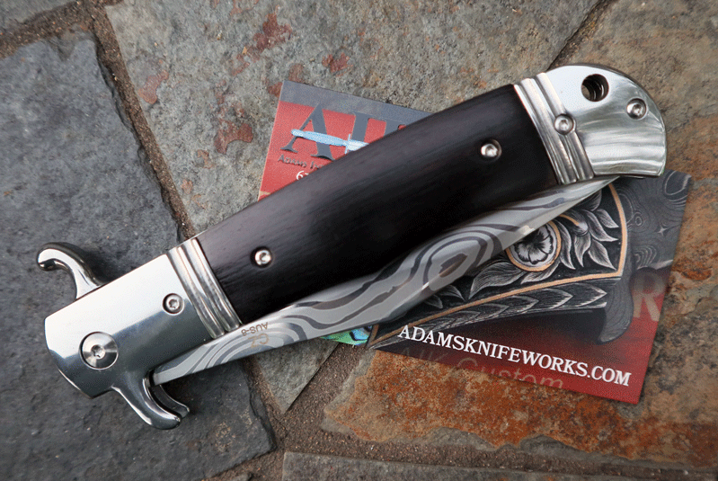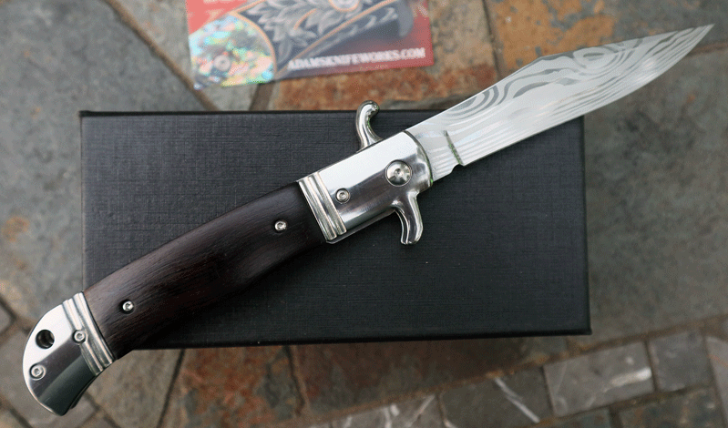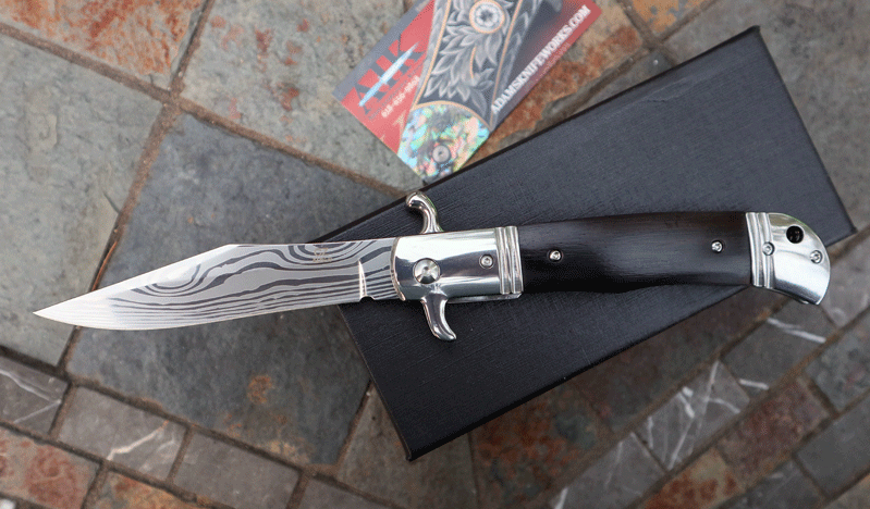 Features a 4" Polished Clip Point Blade made of AUS-8 Stainless with a Damascus Print Blade that is razor sharp. Stainless Bolsters and Liners. Built in Finger Guard is actually the hidden opening mechanism. Press down on the lower part of the "hilt" or finger guard with your index finger, (located on the spine), and this activates the leaf spring operated switchblade. Features a rock-solid liner lock. Lanyard hole is located in the bottom bolster.